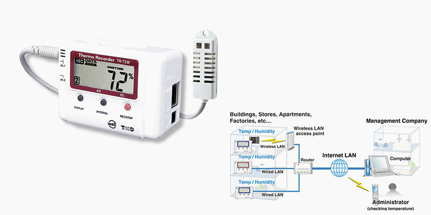 Thermo Grabadora TR-7W es un nuevo tipo de temperatura y humedad Data Logger que incorpora una interfaz Ethernet / LAN. Esto permite recoger datos rápidamente y monitorear las condiciones actuales; puede incluso enviar emails de aviso. Estos registradores de datos se pueden conectar ya sea a una LAN por cable o inalámbrica, permitiendo el control de costo efectivo de la temperatura y la humedad desde ubicaciones remotas